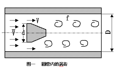 當(dāng)被測(cè)介質(zhì)流過柱體時(shí),在柱體兩側(cè)交替產(chǎn)生旋渦,旋渦不斷產(chǎn)生和分離,在柱體下游便形成了交錯(cuò)排列的兩列旋渦即“渦街"。理論分析和實(shí)驗(yàn)已證明,旋渦分離的頻率與柱側(cè)介質(zhì)流速成正比。