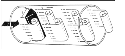 在流體中設置非流線型旋渦發生體(阻流體),則從旋渦發生體兩側交替地產生兩列有規則的旋渦,這種旋渦稱為卡曼旋渦,如圖(一)所示。