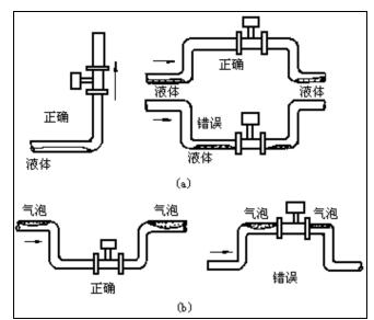 測量液體時,為了保證管內充滿液體,所以在垂直或傾斜管道安裝儀表時,應該保證液體流動方向從下而上。若管道內含少量氣體,為了防止氣體進入儀表測量管,儀表應安裝在管線的較低處