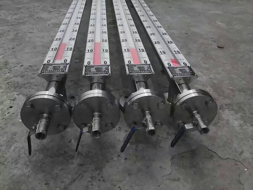 液位計根據浮力原理和磁性耦合作用原理工作的。當被測容器中的液位升降時,液位計主導管中的浮子也隨之升降,浮子內的永久磁鋼通過磁耦合傳遞到現場指示器,驅動紅、白翻柱翻轉180°,當液位上升時,翻柱由白色轉為紅色,當液位下降時,翻柱由紅色轉為白色,指示器的紅、白界位處為容器內介質液位的實際高度,從而實現液位的指示。